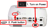 Turn on your laptop first. Then turn on the projector by first turning power button to | and then push the top power button.